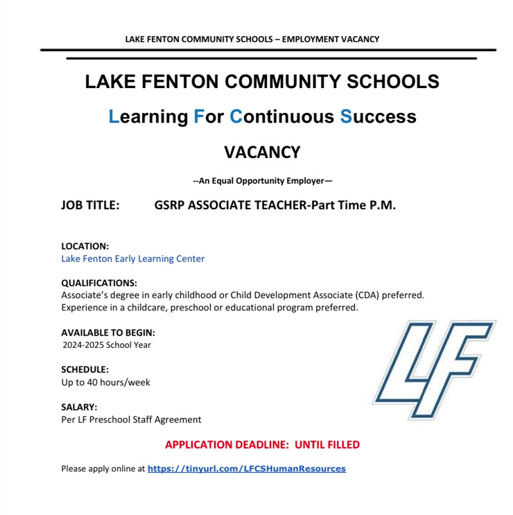 πβπ€ Preschool enrollment is now open for the 25-26 school year! See flyer for details and enroll now at https://www.lakefentonschools.org/page/enrollment π€βπ#LFLeads #ProudtobeBLUE